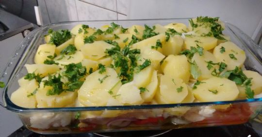 1/2kg de bacalhau; 2 pãezinhos; 1/2kg de batatas; 3 a 4 tomates; 1 cebola, coentro, salsa e cebolinha picadas; ½ pimentão; 1 dente de alho socado; 1 colher (sobremesa) de manteiga 2 colheres (sopa) de azeite; 2 colheres (sopa) de vinho branco; 1 copo de caldo de bacalhau ;1 colher (sobremesa) de puré de tomate; pimenta-do-reino; queijo parmesão ralado. Dessalgue o bacalhau e escalde. Retire pele e espinhas, para preparar o caldo. Desfie a carne e reserve. Soque o alho e pique a cebola, o pimentão, os tomates (sem pele e sementes) e os temperos verdes. Refogue o bacalhau na manteiga, juntamente com todos os temperos picados. Regue com o vinho branco e deixe evaporar um pouco. Acrescente o caldo e o puré de tomate, deixando cozinhar em fogo brando até engrossar. Unte ema forma refratária, forre o fundo com rodelas de batata e coloque um pedacinho de manteiga sobre cada uma, distribuindo por cima um pouco do refogado de bacalhau. Repita as camadas até terminarem os ingredientes, reservando um pouco do refogado para fazer uma camada adicional. Corte os pães em rodelas grossas e arrume-as sobre a última camada de bacalhau, bem juntas. Cubra com refogado reservado e distribua pedacinhos de manteiga por toda a superfície do prato. Polvilhe com bastante parmesão e leve ao forno bem quente (250ºC) por 15 minutos.